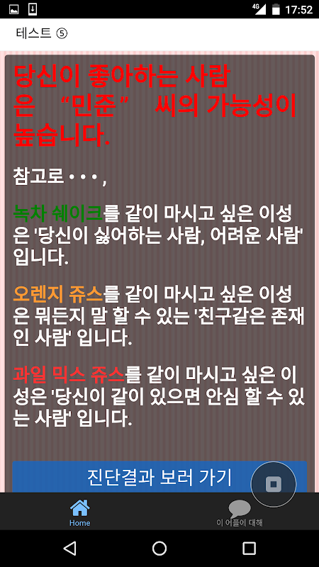 ※ '좋아하는 사람 누구야?' 는 무료로 할 수 있는 심리테스트이고 정식적인 심리진단은 아닙니다.