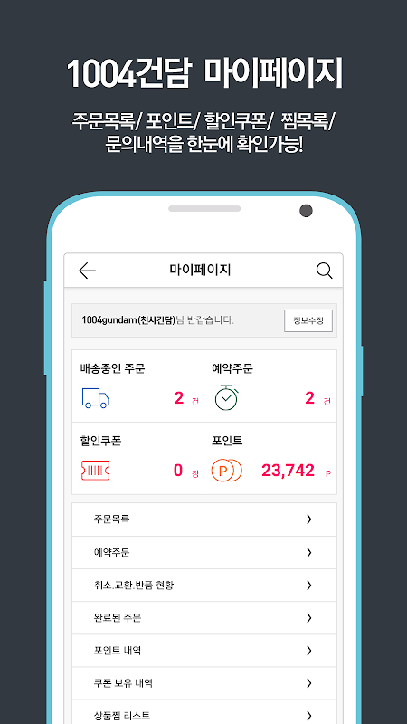 -주문목록/ 포인트/ 할인쿠폰/ 찜목록/ 문의내역을 마이 메뉴에서 한눈에 확인할 수 있습니다.