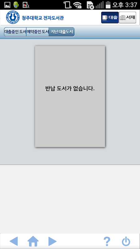 청주대학교 전자도서관의 도서이용 서비스를 스마트 폰에서 손쉽게 사용할 수 있도록 구성하였습니다. 도서의 검색에서 시작하여 도서 대출현황, 예약, 신청 등 도서관에서 이용할 수 있는 기능을 청주대학교 전자도서관 홈페이지를 접속하지 않더라도 스마트폰을 통하여 언제 어디서든지 이용할 수 있습니다