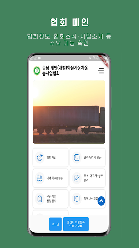 ■ Halaman utama persatuan perniagaan pengangkutan kereta barang Chungcheongnam-do individu (individu) telah dilaksanakan sebagai aplikasi supaya ia boleh digunakan pada mudah alih.