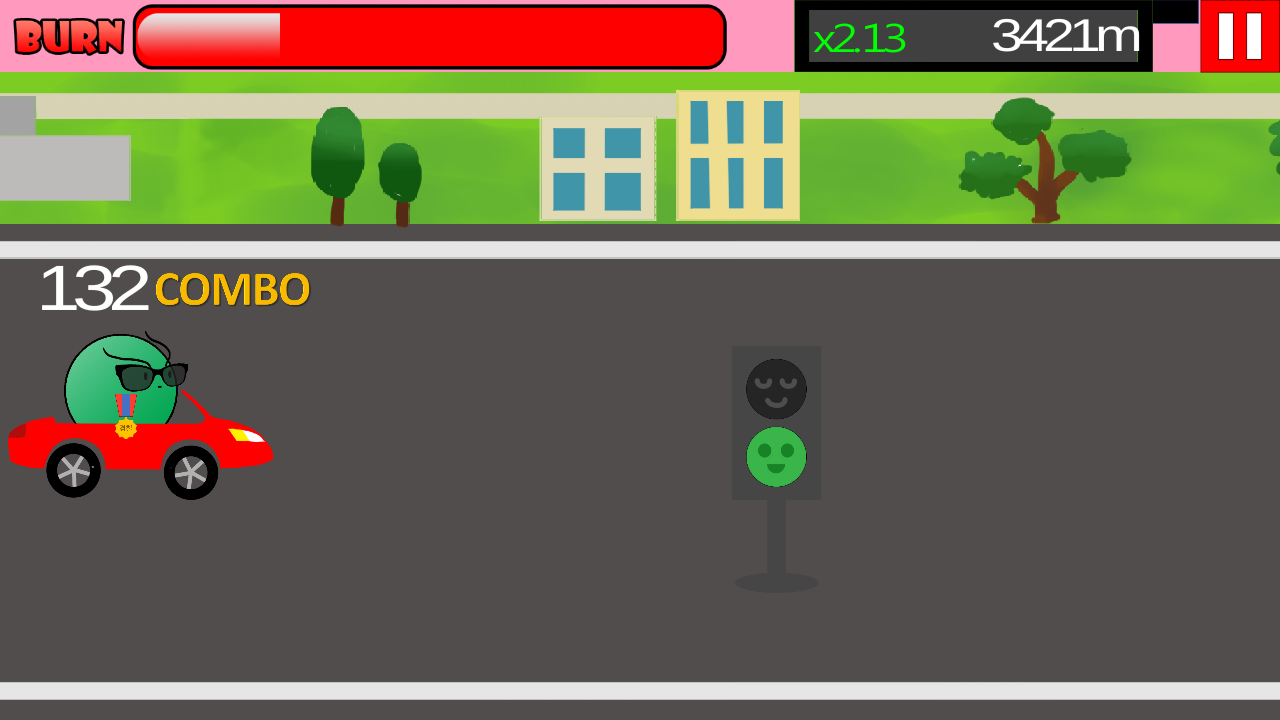 초록불에 지나가서 버닝 게이지를 모으고, 버닝 상태에서 화면을 연타해 도로를 질주하세요!