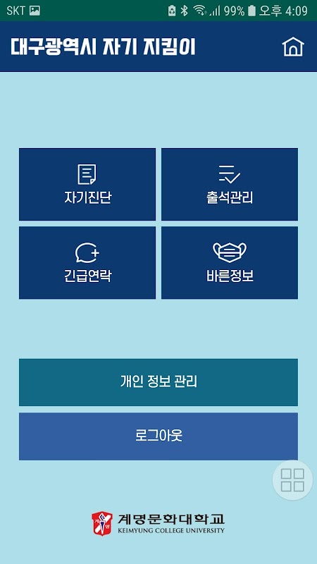 ※ ‘코로나 대구 지킴이’ 앱은 해당 서비스를 이용하는 대학 관계자(대학생, 교수, 교직원)만 이용 가능한 서비스입니다. 대구광역시에서는 코로나19 대응을 위해 학생들에게 코로나19 감염 위험을 주기적으로 알리고, 감염 발생시 신속한 대응이 가능하도록 하기 위해 제공합니다.