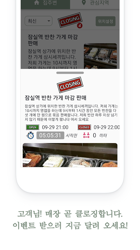 유통기한 임박 또는 당일 마감등 가게 마감 시간까지 판매해야 하는 식품 또는 제품등을