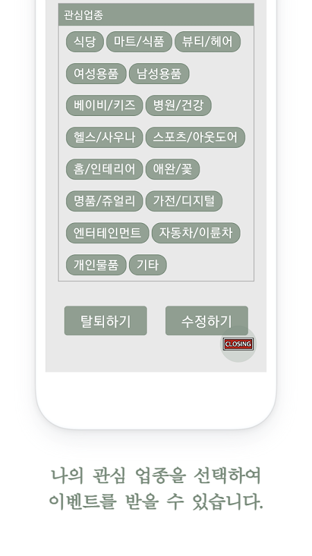 개인 이용자는 내 주변 또는 관심지역에서 진행하는 이벤트 정보중 관심 업종만을 필터링하여 선택적으로 받아 볼 수 있습니다.