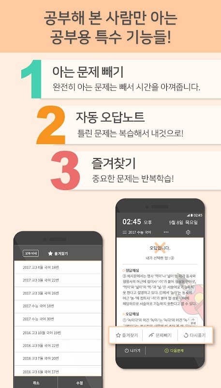 Puluhan soalan terdahulu daripada peperiksaan olok-olok utama Ujian Keupayaan Skolastik Korea (SAT) disediakan tanpa ketinggalan, termasuk jawapan yang betul dan jawapan yang salah. Dan peperiksaan yang akan dijalankan pada masa hadapan akan dikemas kini serta-merta tanpa ketinggalan, jadi aplikasi yang satu ini sudah cukup untuk menakluk soalan-soalan sebelumnya.
