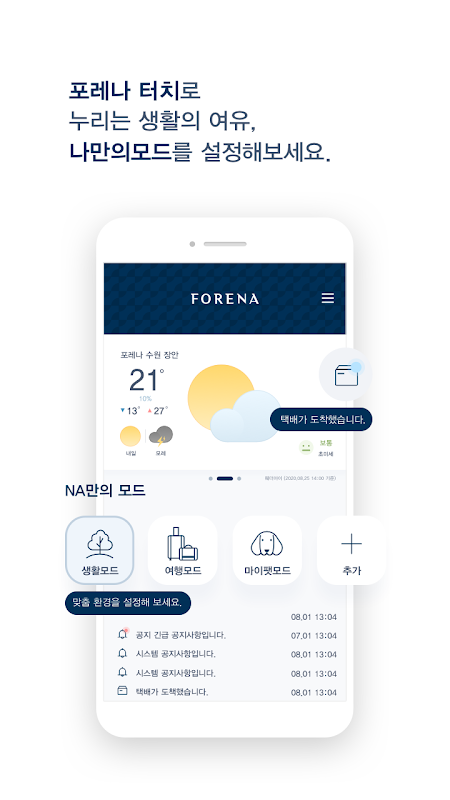 Apl rumah pintar FORENA menyemak dan mengawal peranti rangkaian rumah dan peralatan rumah pintar di dalam rumah dari mana-mana sahaja. Kami menyediakan pelbagai perkhidmatan mudah untuk memeriksa keadaan rumah kami di dalam dan di luar rumah dan untuk berkomunikasi dengan jiran kami. Nikmati kehidupan kediaman yang selesa dengan apl Rumah Pintar Forena.