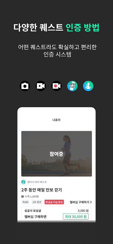 Ia adalah usaha yang membolehkan anda mencipta tabiat kesihatan dan gaya hidup dalam kehidupan harian anda, seperti Miracle Morning, berjalan 10,000 langkah sehari, belajar bahasa Inggeris, dan mengambil suplemen pemakanan, dan menerima ganjaran mata (Kcal) bernilai sehingga 30,000 won jika berjaya.