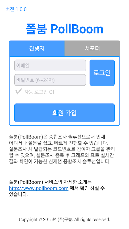 다수를 상대로 1:1 대면 설문을 진행할 경우 폴붐(PollBoom)의 서포터 로그인을 사용합니다.