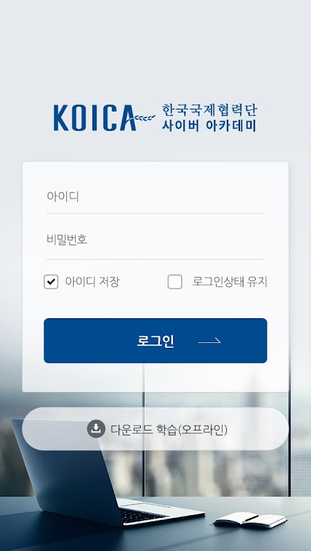 PC환경의 한국국제협력단(코이카) 사이버 연수원(http://koica.hunet.co.kr)의 아이디와 비밀번호로 로그인 가능하며, 주요 서비스를 본 모바일 앱에서도 사용하실 수 있습니다.