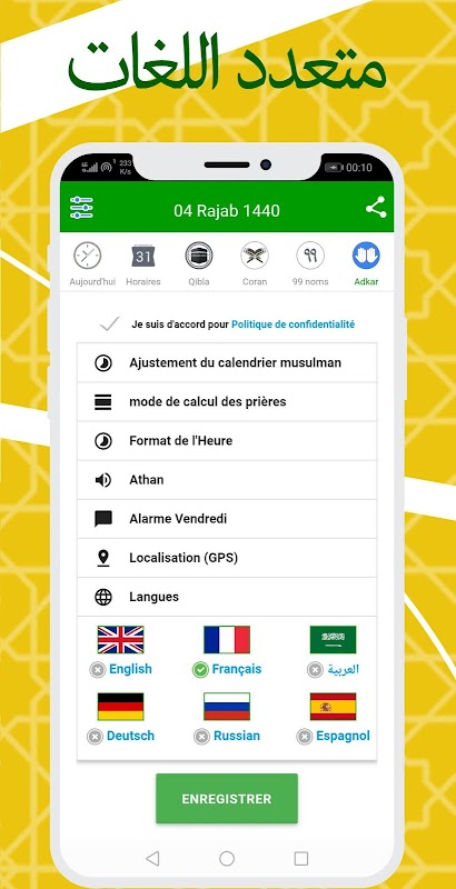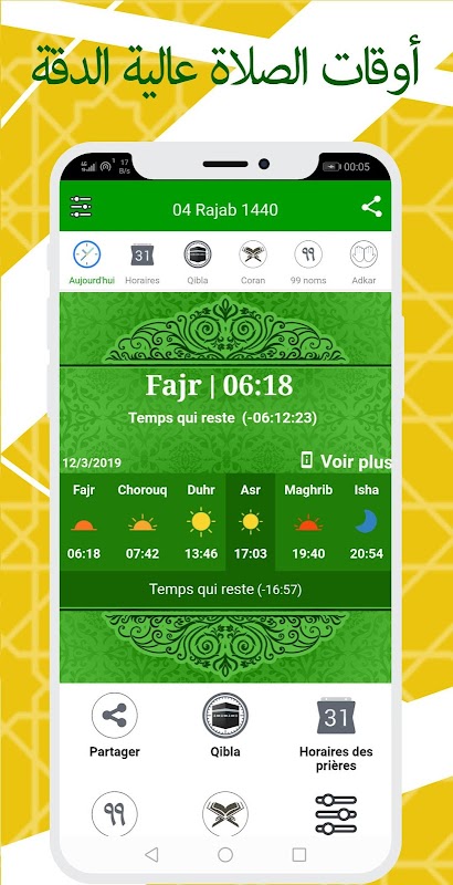 ✓ أذان أو أذان ، مع إمكانية اختيار أغنية أذان ووقت التنبيه قبل صلاة الجمعة في الإعدادات ،