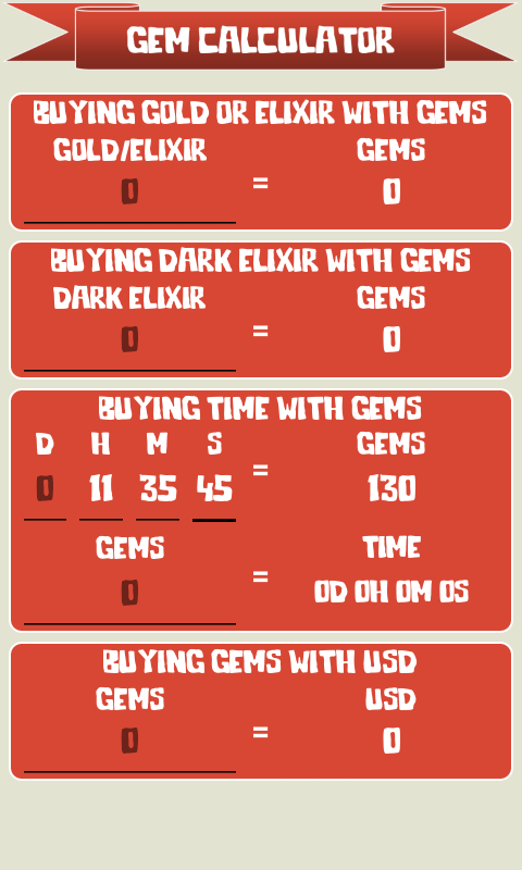 Menulis jumlah yang dikehendaki dalam bidang kelabu dan kalkulator ini untuk Clash of Clans akan mengira segala-galanya serta-merta.