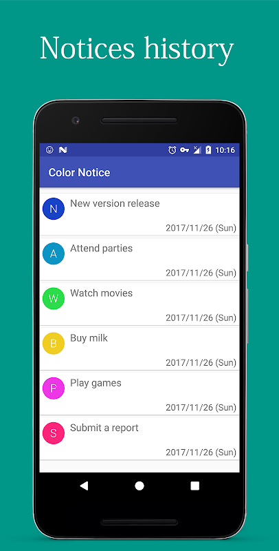Instead of many To Do List Apps, You will see the reminders every time in the notification bar(status bar), so that you will not forget your tasks, dates, meetings or whatever. with Color Notifier Do not need to always remember your task and date.