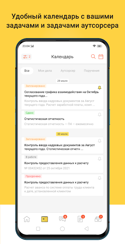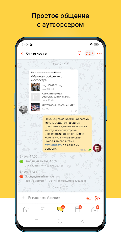 Di dalam akaun anda, anda boleh berkomunikasi secara langsung dengan penyumber luar. Bekerja dengan tugas, hantar dokumen utama terus dari aplikasi dan simpan semuanya di satu tempat. Lacak pesanan terus pada peranti mudah alih anda.