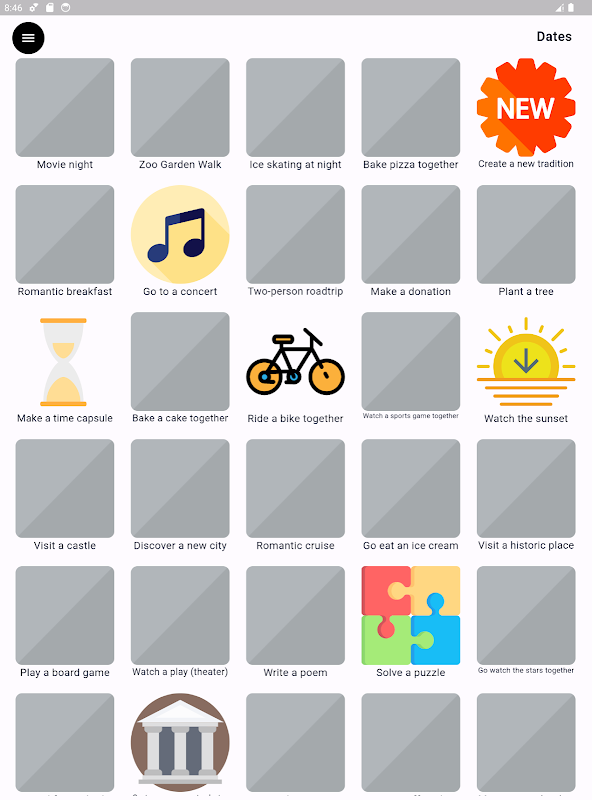 Setiap idea tarikh mempunyai imej comel yang boleh anda conteng selepas anda melengkapkannya dengan pasangan anda. Ini akan membantu anda melihat sekilas tentang tarikh yang telah anda selesaikan.