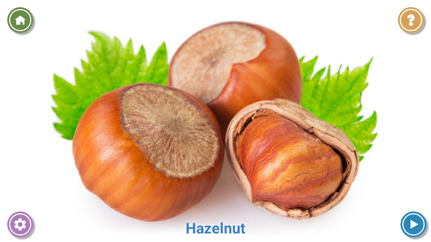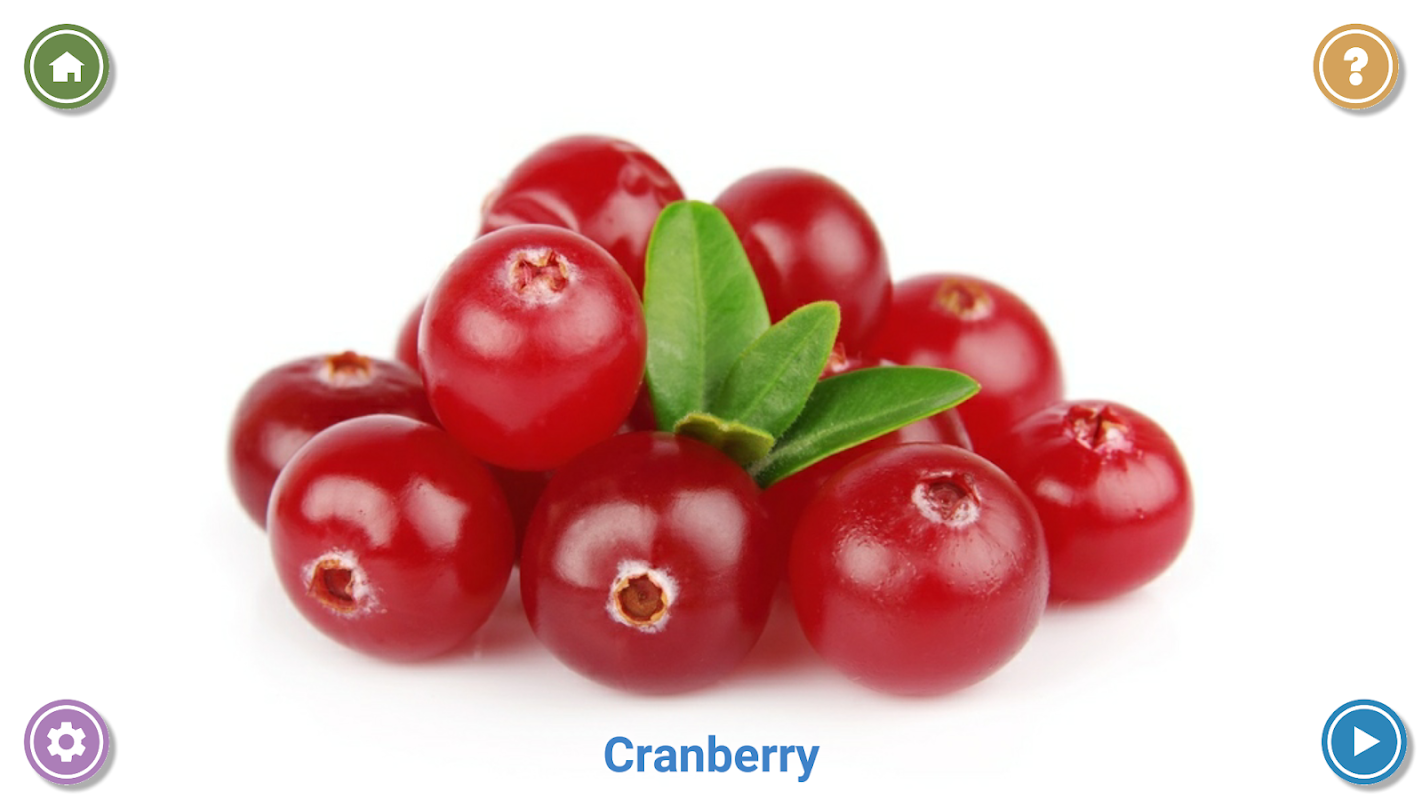 Aplikasi pendidikan ini membolehkan anak-anak belajar buah-buahan, sayur-sayuran, kacang-kacangan dan buah beri. 100 foto profesional berkualiti tinggi ada.