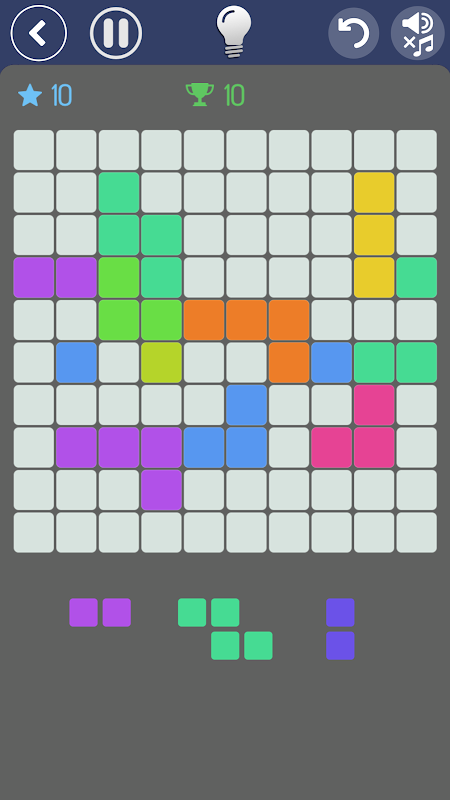 1010 color block is a simple brain teaser, match merge block puzzle game. Drag and merge the color blocks from the bottom of the screen onto the game board. Once an entire row or column on the game board has been filled it will then be removed from the bored and you will recieve points. When a row or column of block is filled, it will be eliminated, and the game will end when there is no longer a blank space to place the block.