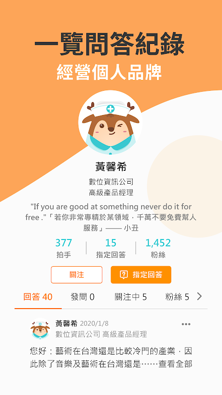 Setakat ini, Klinik Kerjaya telah berjaya merekrut lebih daripada 1,800 Pemberi yang bersemangat. Sebagai tambahan kepada Pemberi yang spontan dan bersemangat yang datang ke tapak untuk menjawab soalan, laman web ini juga menjemput syarikat atau profesional untuk kekal dalam talian dari semasa ke semasa, supaya industri dan kategori pekerjaan yang diliputi oleh Pemberi adalah lebih komprehensif, dan setiap soalan dijangka akan dijawab.Jawapan Pemberi profesional yang sesuai.