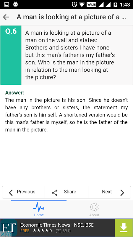 Tips: Permohonan pertama akan menunjukkan Teasers Brain (masalah) sahaja. Ambil masa anda untuk menyelesaikan masalah ini dengan diri anda terlebih dahulu. Selepas itu anda boleh klik pada butang jawapan untuk melihat jawapan yang sebenar.