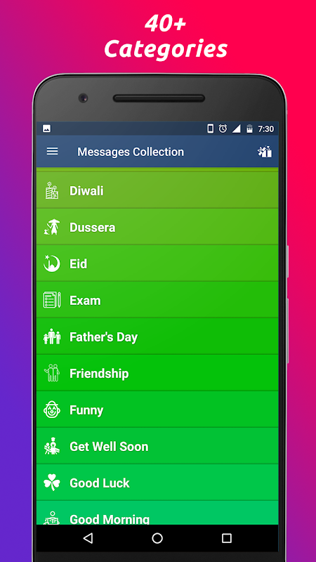 "175000+ mesej Collection" app terdiri kategori Perutusan LOVE untuk BREAK-UP, BIRTHDAY untuk takziah, GOOD MORNING untuk GOOD NIGHT, HARI IBU untuk Hari Bapa, SORRY untuk TERIMA KASIH, PERKAHWINAN untuk ANNIVERSARY, EID untuk Diwali, TAHUN BARU untuk CHRISTMAS dan banyak lagi. Aplikasi ini mengandungi lebih daripada 42+ kategori dan menambah lebih banyak dari hari ke hari.
