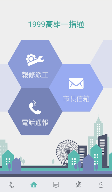 整合了高雄市政府多元的便民服務,包括:1999電話專線、市長信箱、報修派工、市政新聞、市政FAQ、停車拖吊、里民防災、服務地圖 等各大功能。