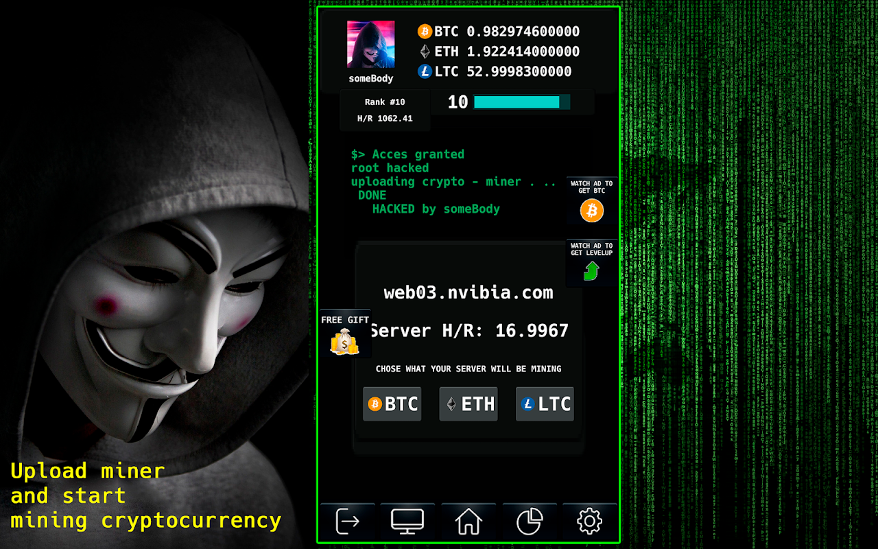 Satu klik butang permainan dengan tema peretasan dan cryptomining.