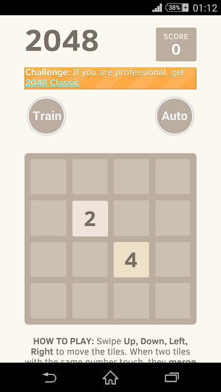 Swipe (Up, Down, Left, Right) to move the tiles. When two squares with the same number touch they merge into a one tile or a larger number (2 + 2 = 4, 4 + 4 = 8, and so on). When 2048 tile is created, the player wins!