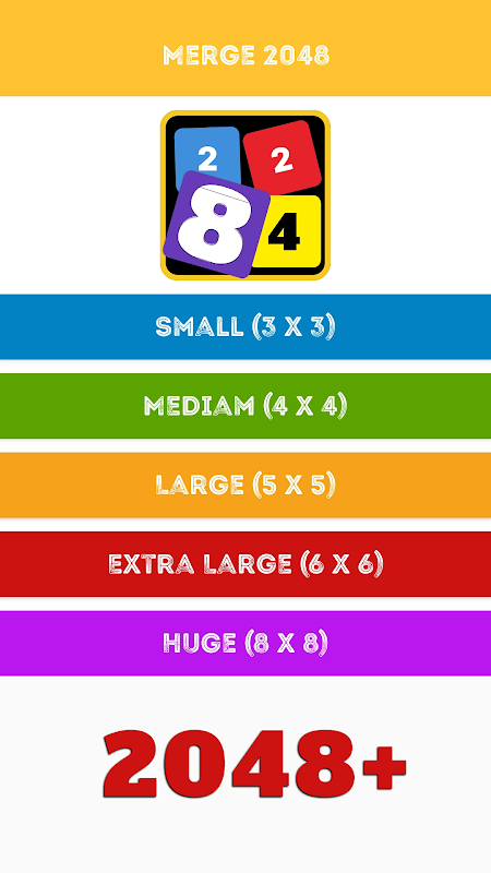Mulailah dengan 2 yang sederhana, dan gabungkan ubin dengan terampil untuk mencapai pencapaian seperti 4, 8, 16, 32, 128, 512, 1024, dan 2048 pamungkas. Jika kamu penggemar game angka dan teka-teki, nikmati pengalaman asah otak di tahun 2048. Nikmati beragam permainan, dari papan 3×3 terkecil hingga 8×8 yang menantang, semuanya tersedia secara offline.