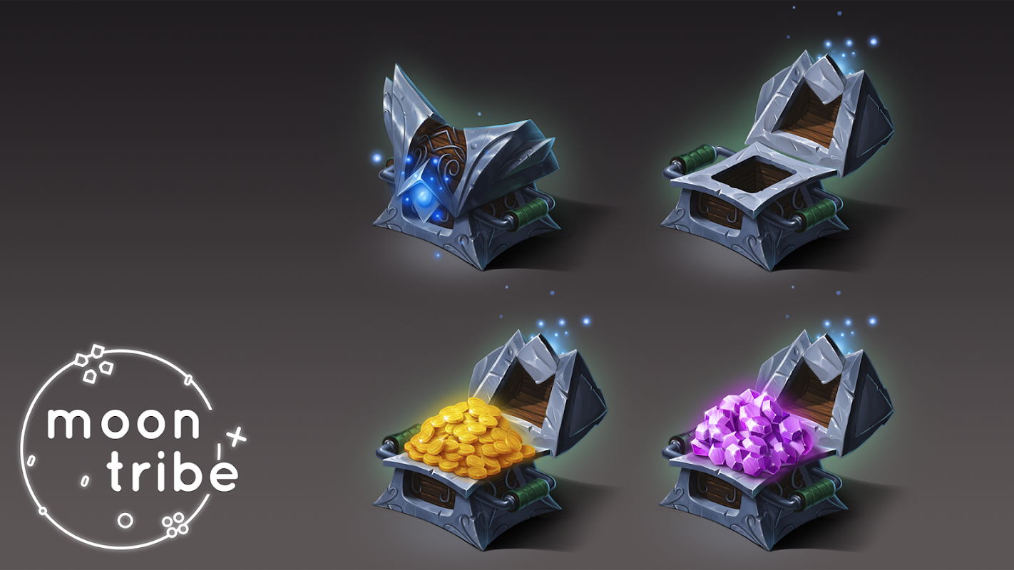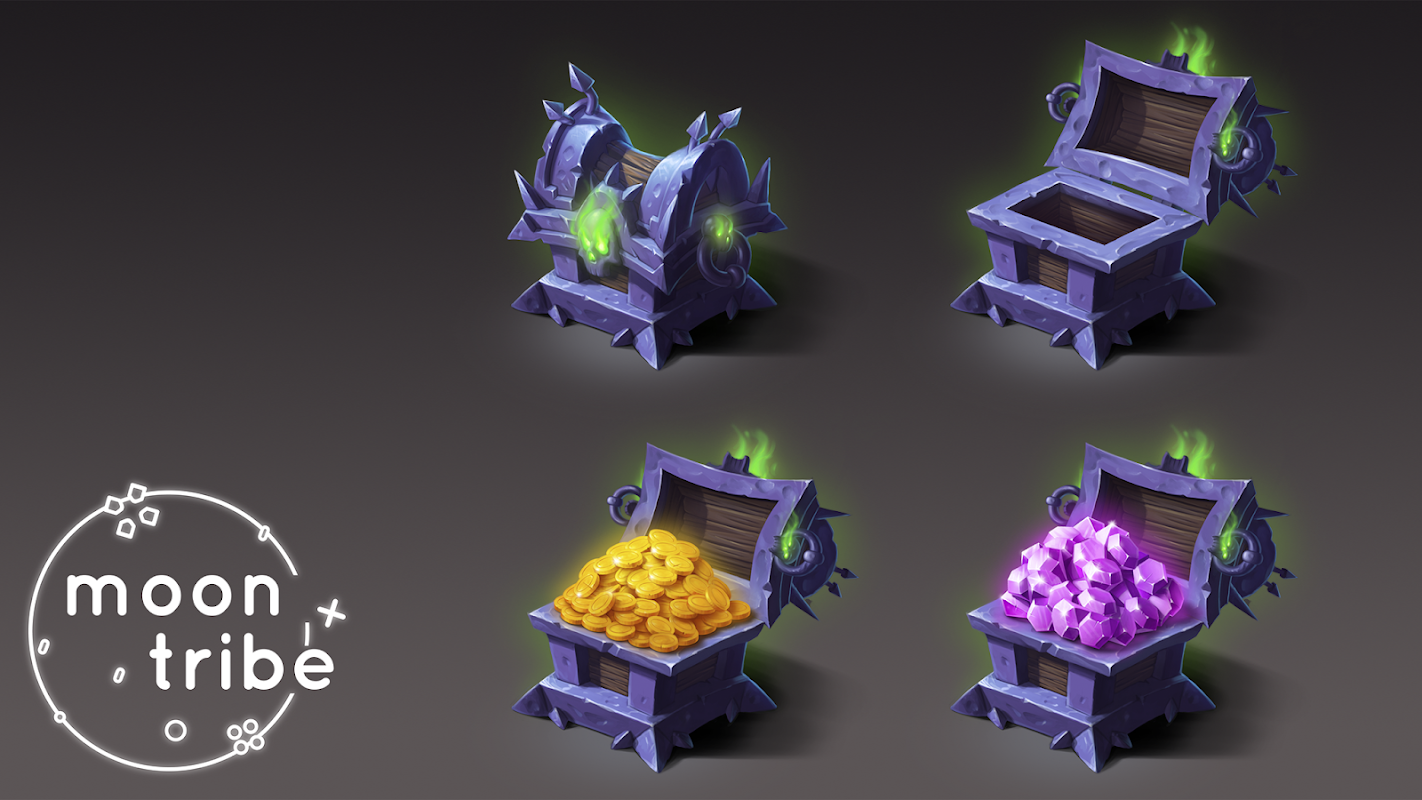 Hand-painted set of fantasy-themed 2D chests. AAA quality. High resolution. Demo scenes and previews. Everything set and ready for use.