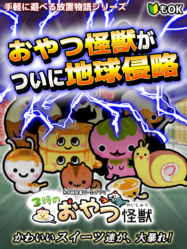 カワイイおやつが地球征服!?今度の主役はスイーツだ!種類豊富なおやつ怪獣達から地球を守れ!無料で最後まで遊べる!物語が進む大人気のお手軽放置ゲームシリーズ。