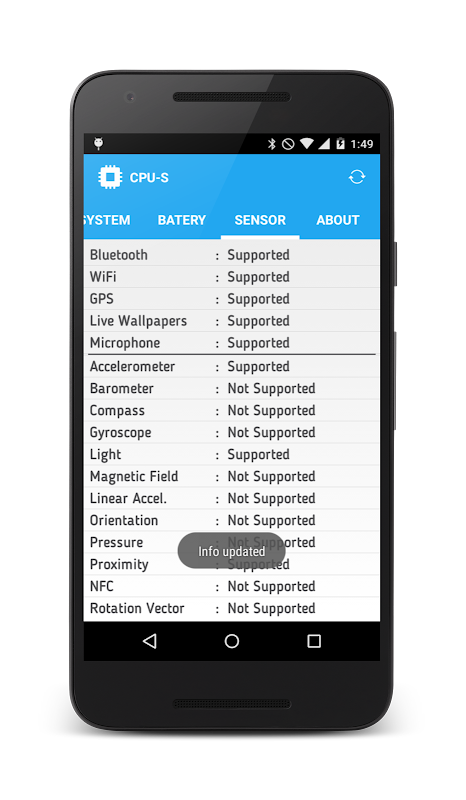 CPU S shows your device CPU, Device, System, Battery & Sensor info in one app.