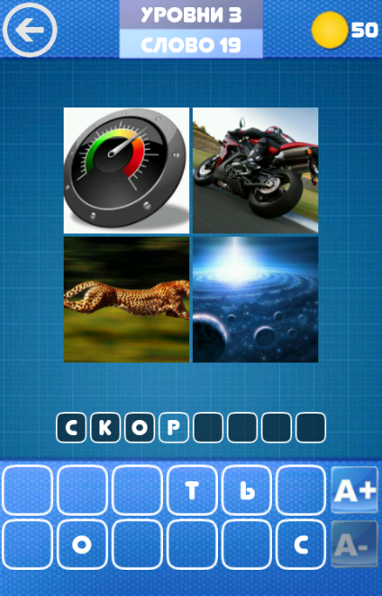 На экране 4 фото. Что за слово изображено на них? Cоставьте это слово из заданного набора букв. Головоломки заставляет задуматься и проверить ваши знания! Отгадывайте слово за словом, пользуясь при необходимости подсказками.