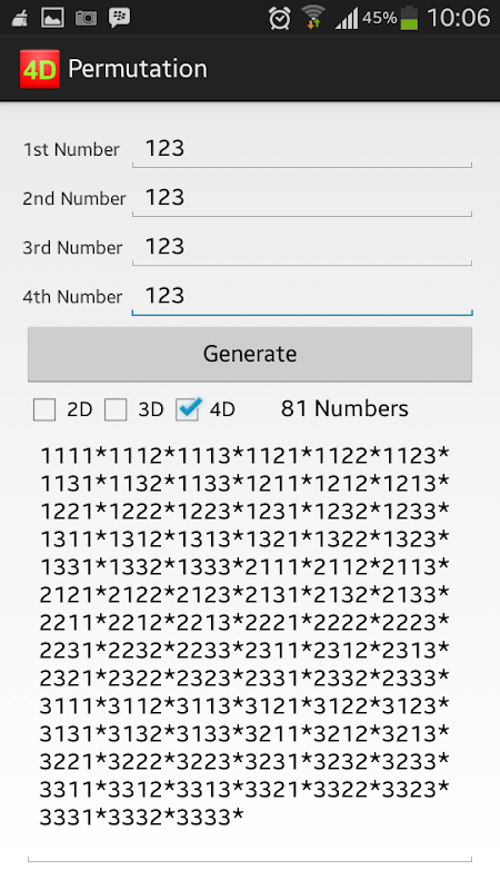 Permutation 4D is a tool to generate a permutation of 2,3, or 4 digits of the numbers given.
