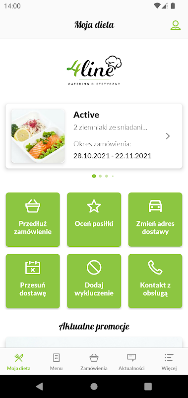 untuk menguruskan diet yang dibeli dan berkomunikasi dengan katering. Terima kasih kepada aplikasi < br /> anda akan menjadi Anda boleh mengendalikan diet anda dengan selesa dari telefon anda tanpa perlu pergi ke laman web katering