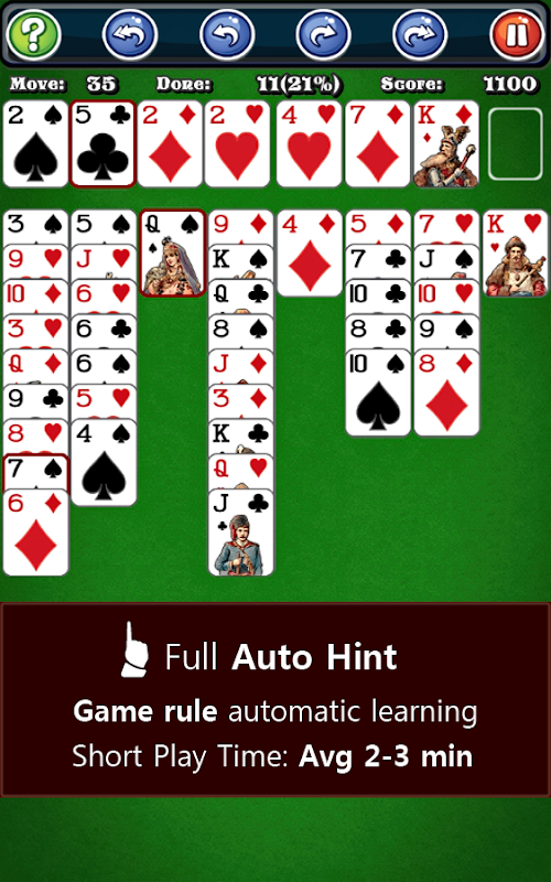 permainan Solitaire kami mengambil formula permainan yang dipercayai. Dengan grafik yang menakjubkan dan animasi versi ini permainan kad popular adalah salah satu permainan kad solitaire yang paling indah yang anda akan dapati.