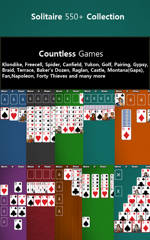 * Pelbagai Permainan Jenis (Klondike, Freecell, Spider, Canfield, Yukon, Golf, Pairing, Gypsy, Braid, Teres, Baker Dozen, Raglan, Castle, Montana (Gaps), Kipas, Napoleon, empat puluh pencuri dan banyak lagi)