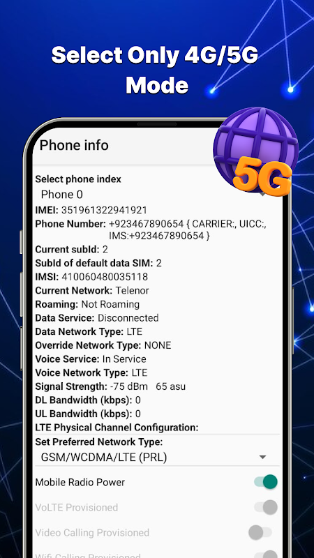 Switch to only LTE 4G/5G easily, run test speed, check signal, SIM & device info