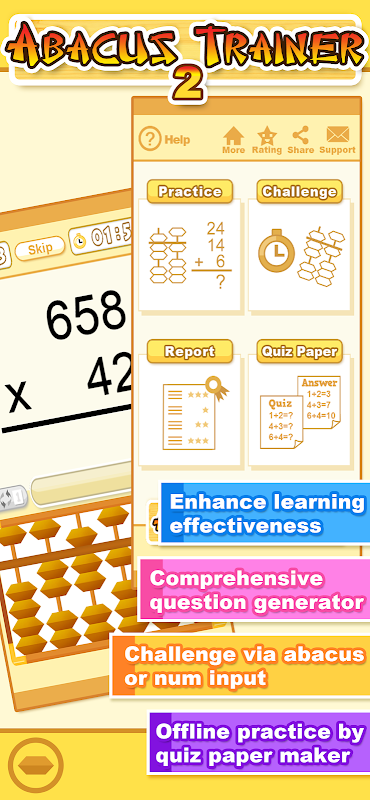 Abacus Trainer 2 adalah penjana soalan dibuat mengikut kemahiran yang diperolehi dalam pengiraan pesat. Ia menyediakan pelbagai jenis pilihan yang boleh dipilih secara fleksibel untuk memenuhi keperluan penggerudian. Kolam yang besar dan kombinasi soalan meningkatkan minat pembelajaran. Latihan boleh ditetapkan pada apa-apa jenis pengiraan matematik veda termasuk formula bernas pendaraban. input jawapan fleksibel boleh dimasukkan sama ada dengan menggunakan abakus atau kekunci angka.
