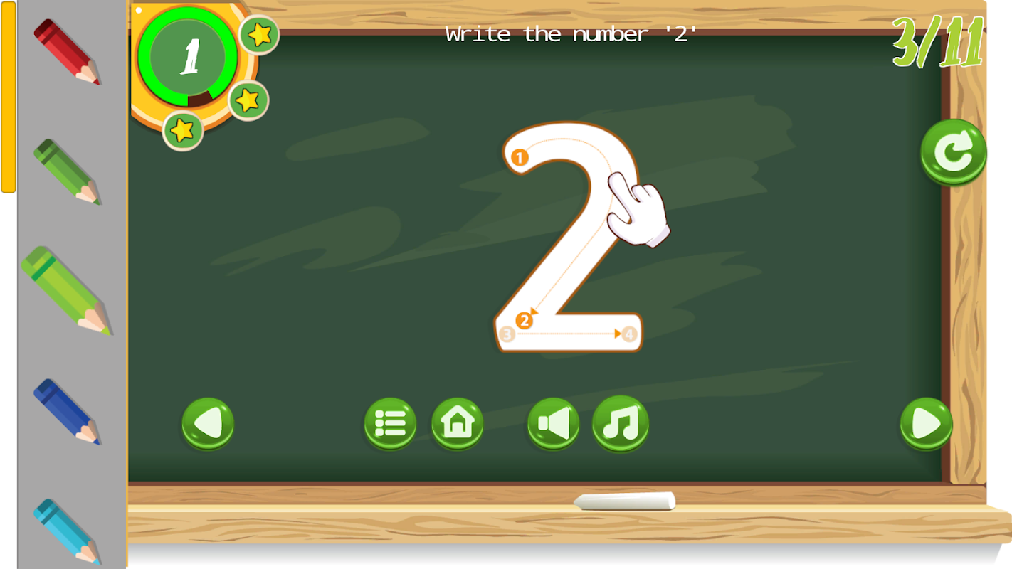 tempat kejadian menu ini akan membantu kanak-kanak untuk menulis nombor dari 0 hingga 10. Panduan permohonan juga di mana untuk mula menyentuh dan menulis.