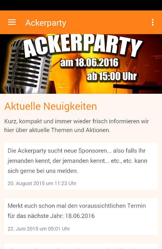 Acker Parti, acara rock terbuka dengan kumpulan-kumpulan pendatang baru dari Cologne, Jerman. Masuk percuma! Makanan murah dan minuman! Foosball jadual! Bull Riding! Jousting! Dan kini sebagai aplikasi telefon pintar. Semua berita, gambar dan peristiwa sebagai tanah secara langsung pada telefon pintar anda. Dan kerana telefon pintar hanya telefon, boleh menjadi butang yang bersamaan dengan mewujudkan sambungan. Aplikasi PIHAK BIDANG sentiasa menyediakan talian terus.