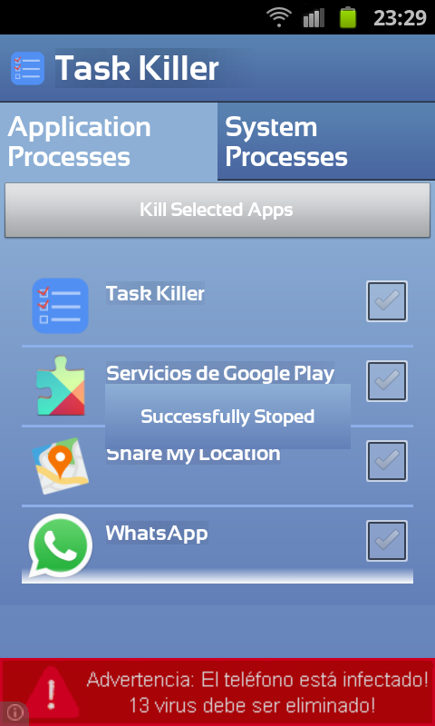 Advanced Task Clean Master is pretty simple. Open this tool and take a look at the running applications list. Check some apps you want to kill (don't kill Advanced Task Clean Master) or some system apps, tap the button 'Kill Selected Apps', Advanced Task Clean Master will kill all applications checked.