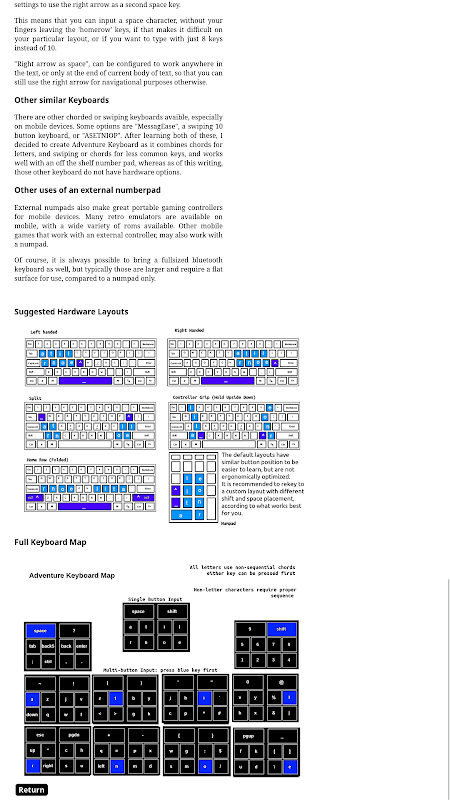Semua kord Papan Kekunci Pengembaraan menggunakan paling banyak 2 butang. Ia direka bentuk untuk berfungsi dengan baik pada skrin sentuh atau papan kekunci mudah alih kecil, seperti pad nombor.