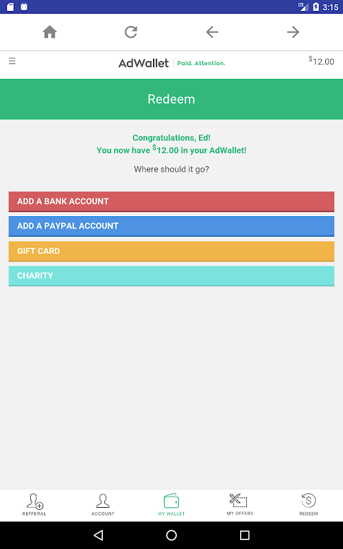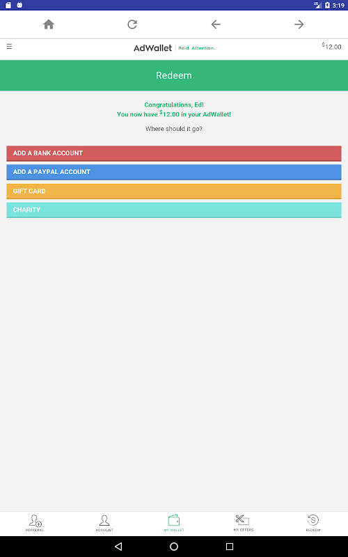3. Once you complete the video and provided us your feedback, your AdWallet account will be credited. When you have earned $10, you can redeem your rewards.