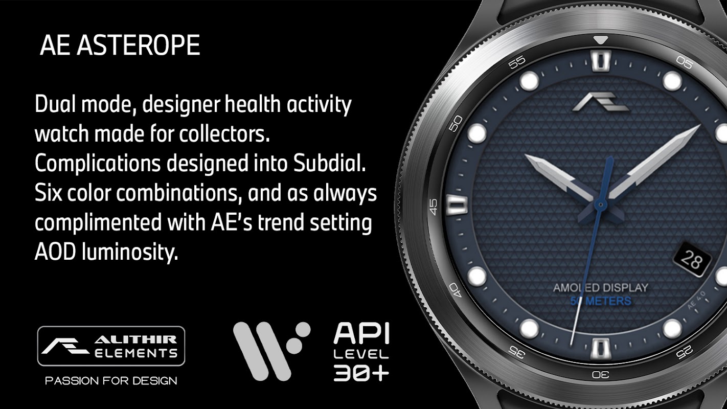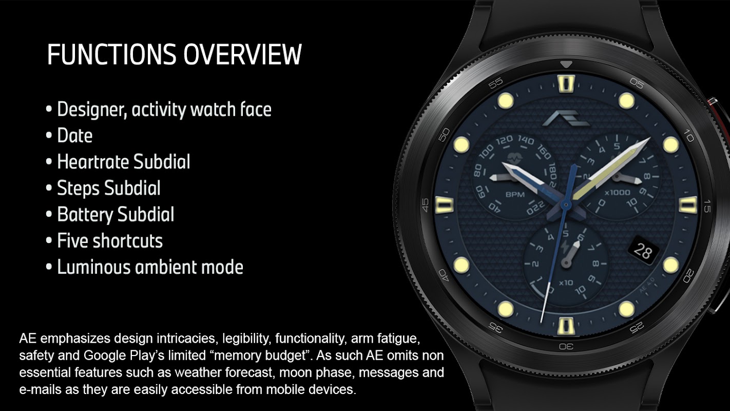 Muka jam tangan AE dibina dengan Watch Face Studio yang dikuasakan oleh Samsung dengan API 30+, tidak disokong oleh Google Play lebih 13,840 peranti Android. Jika peranti Android anda terjejas, sila cari dari jam tangan atau semak imbas dan muat turun dari penyemak imbas web pada komputer peribadi anda. Rujuk panduan pemasangan oleh Pembangun Samsung https://youtu.be/vMM4Q2-rqoM