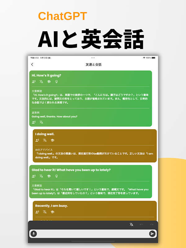 Berlatih perbualan bahasa Inggeris dengan Chat GPT! Dilengkapi dengan penjelasan tatabahasa, pembetulan, dan fungsi terjemahan! Tingkatkan kemahiran anda dengan latihan bercakap dan mendengar!