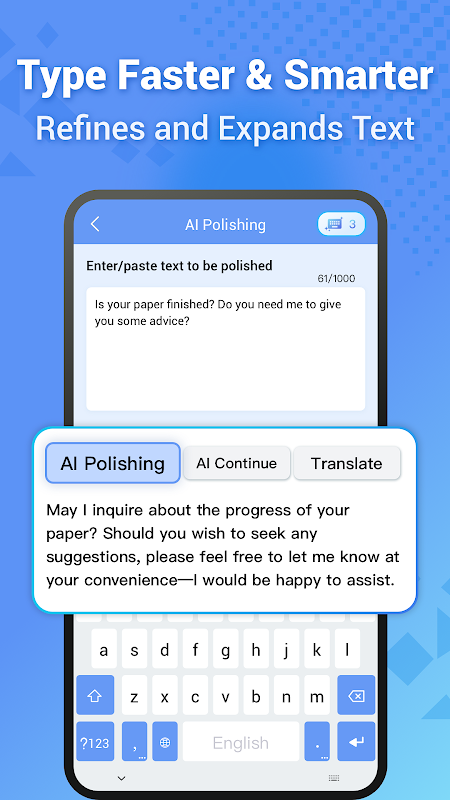 Papan Kekunci AI - Menulis & Chatbot adalah lebih daripada sekadar penaip pintar; ia adalah pembantu penulisan semua-dalam-satu anda. Perbaik & kembangkan teks anda dengan mudah dan tawarkan cadangan yang diperibadikan, papan kekunci AI ini mentakrifkan semula mudah alih
