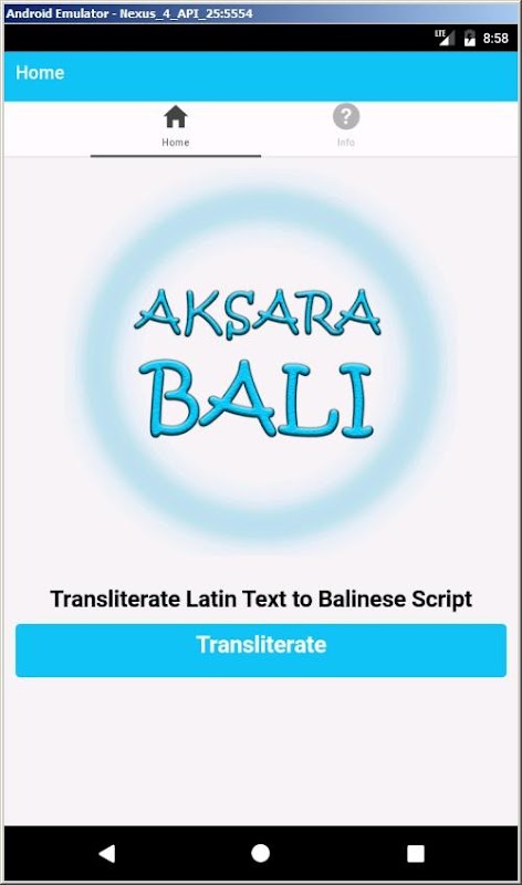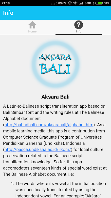 Sebagai media pembelajaran mudah alih, aplikasi ini merupakan sumbangan dari Program Siswazah Sains Komputer Universiti Pendidikan Ganesha (Undiksha), Indonesia (http://pasca.undiksha.ac.id/ilkom/) untuk pemeliharaan budaya setempat yang berkaitan dengan skrip Bali pengetahuan transliterasi.