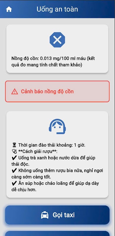 Berikan cadangan: boleh terus minum, perlu berehat atau tidak boleh memandu