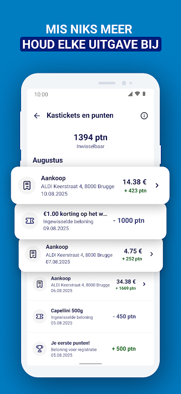 Lebih jimat dengan apl ALDI. Anda kini boleh mengumpul mata ALDI dengan setiap pembelian. Hanya imbas kad ALDI digital anda semasa pembayaran dan tukar mata anda kepada produk dan diskaun percuma. Faedah ini menanti anda: