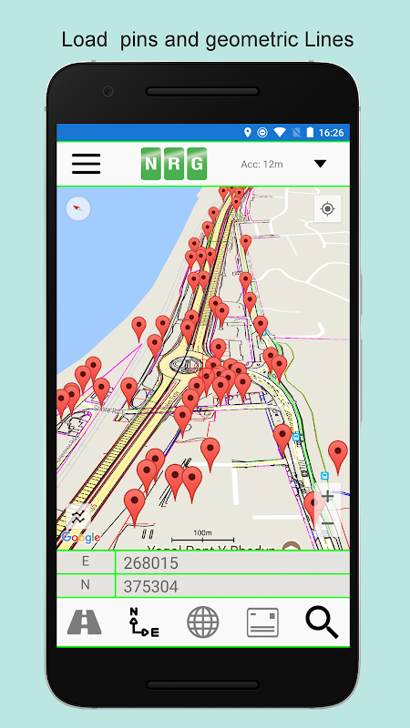 Sesuai untuk diletakkan pada papan pemuka kenderaan anda mod landskap NRG Alignment Viewer menyediakan kemas kini yang jelas dan masa nyata pada kedudukan peranti dari segi koordinat WGS84, Cartesian EN dan Geometric Alignment (Chainage/Station/Meterage).