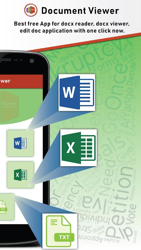 "All Document Reader - DOC PPT XLS PDF TXT" gives a list of all the documents available in your smart phone at one place. Document reader is one of the best which helps you to manage & view your documents & files easily. All the documents files in this application will be found without any effort. With the use of this application you can manage like rename, edit, delete and share file. Documents viewer allows opening office productivity application documents like text files, spreadsheets or presentations located in the file system e.g. SD card, as well downloaded documents, files, Blank document or documents files attached to an email.